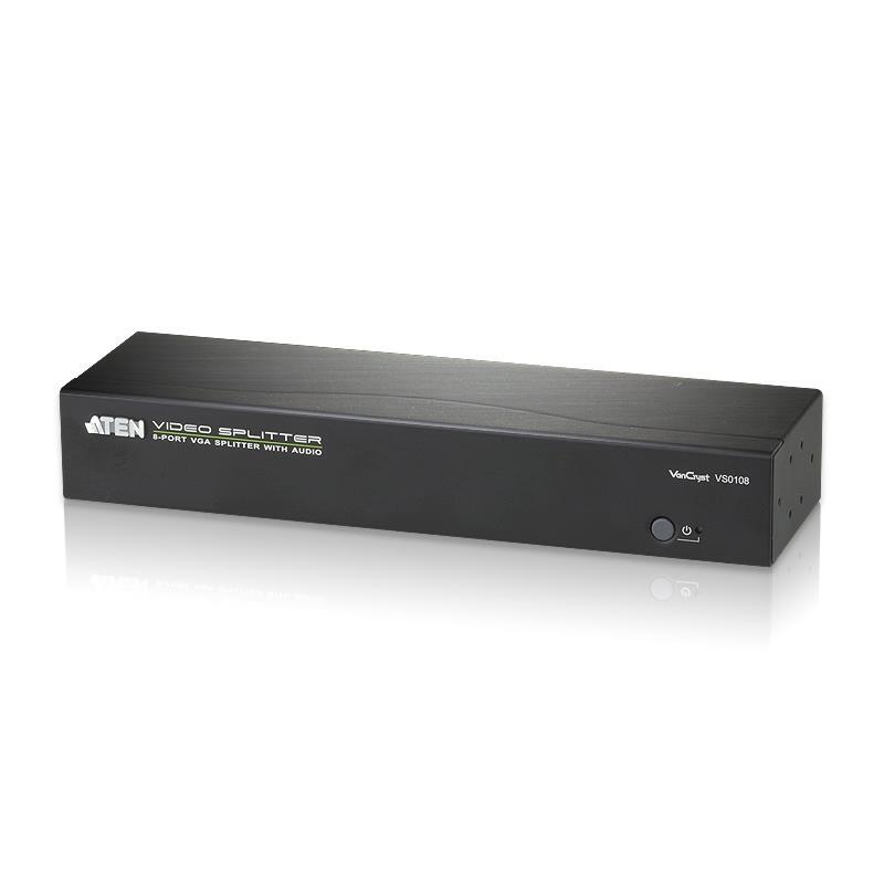 The ATEN VS0108 8-Port VGA Splitter with Audio is VGA splitter that allow a single VGA video and audio signal to be distributed to eight output displays with independent stereo control. The splitter support up to 450MHz video bandwidth, which provides optimum video quality, supported by resolutions up to 1920x1440. Furthermore, for complete systems integration, serial control is standard through the VS0108 built-in RS-232 ports, which allow the splitter to be controlled through a high-end controller or PC. The VS0108 is perfect for conference rooms, training facility & multi-display broadcasting, with cascadable support up to three levels allowing a single video signal to be sent across up to 512 video displays while sustaining the highest quality possible. One video input to 8 video outputs Superior video quality – up to 1920 x 1440 @ 60Hz Supports up to 450MHz bandwidth for high performance video Long distance transmission – up to 30m * Supports VGA, SVGA, UXGA, WUXGA, and multisync EDID Expert – selects the optimum EDID settings for smooth power-up and highest quality display Expandable – provides up to 512 video displays Features RS-232 serial port for command controls ** RS-232 chain control – use RS-232 commands to control cascaded devices via VGA cable Supports stereo audio Plug-and-play – no software installation required Note: * Video content sent over very long distance using a VGA cable might result in slight degradation of the video signal and quality ** The VS0108 AP and GUI operation instructions can be downloaded from the ATEN website (www.aten.com)