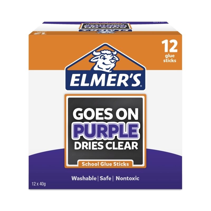 Elmers Purple Disappearing Glue Stick Bx12 is easy to see when applying, but dries fast and colourless. Washes easily off hands and out of clothes. CLEAN-UP: Wipe excess with a damp cloth. If necessary, soap and water may be used.